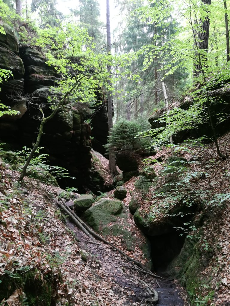 Eine wunderbare, beliebte Strecke startet in Wehlen. Hier geht es in den Uttewalder Grund und in die Teufelsschlüchte. Ein Teil der Strecke ist bequem mit Kinderwagen passierbar. Nur die Teufelschlucht funktioniert nur ohne. Ich habe mir beide Male die Kinder mit der Trage umgeschnallt und bin geklettert. Das war möglich, mitunter aber auch nur auf allen Vieren. Also Pro-Tipp: Keine guten Sachen anziehen!